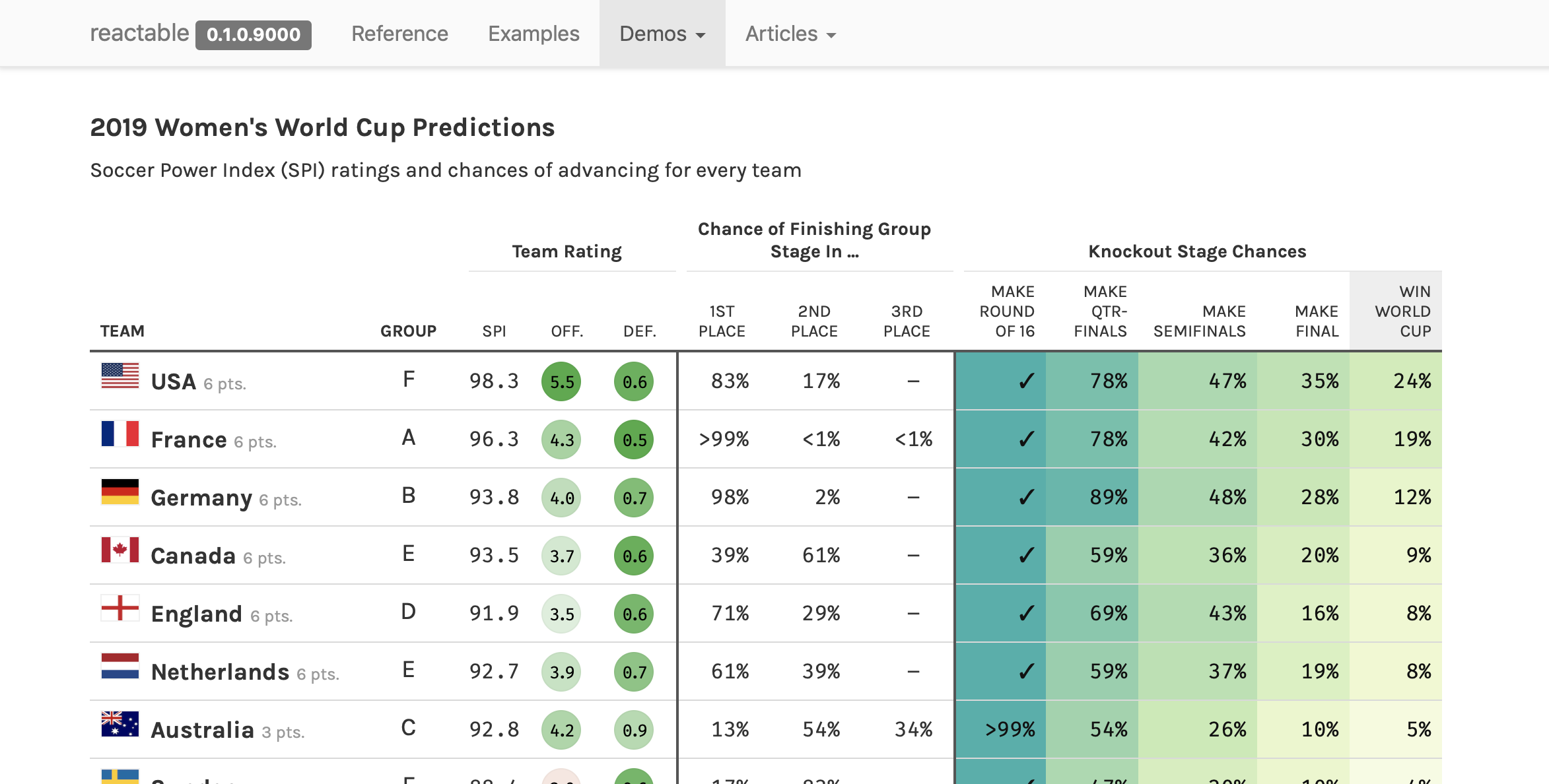 --- # What else? * Lots more it can do — see the [website](https://gt.rstudio.com) -- [Thomas Mock](https://twitter.com/thomas_mock) does great work with tables and often shares tutorials (e.g., [embedding custom features](https://themockup.blog/posts/2020-10-31-embedding-custom-features-in-gt-tables/), [functions and themes](https://themockup.blog/posts/2020-09-26-functions-and-themes-for-gt-tables/), [10 table rules](https://themockup.blog/posts/2020-09-04-10-table-rules-in-r/)). --- class: inverse-red center middle # A few other table options --- # kableExtra ### A few quick examples Make sure to specify `results = "asis"` in your chunk options. .pull-left[ ``` r library(knitr) library(kableExtra) dt <- mtcars[1:5, 1:6] kable(dt) %>% kable_styling("striped") %>% column_spec(5:7, bold = TRUE) ``` ] .pull-right[ <table class="table table-striped" style="margin-left: auto; margin-right: auto;"> <thead> <tr> <th style="text-align:left;"> </th> <th style="text-align:right;"> mpg </th> <th style="text-align:right;"> cyl </th> <th style="text-align:right;"> disp </th> <th style="text-align:right;"> hp </th> <th style="text-align:right;"> drat </th> <th style="text-align:right;"> wt </th> </tr> </thead> <tbody> <tr> <td style="text-align:left;"> Mazda RX4 </td> <td style="text-align:right;"> 21.0 </td> <td style="text-align:right;"> 6 </td> <td style="text-align:right;"> 160 </td> <td style="text-align:right;font-weight: bold;"> 110 </td> <td style="text-align:right;font-weight: bold;"> 3.90 </td> <td style="text-align:right;font-weight: bold;"> 2.620 </td> </tr> <tr> <td style="text-align:left;"> Mazda RX4 Wag </td> <td style="text-align:right;"> 21.0 </td> <td style="text-align:right;"> 6 </td> <td style="text-align:right;"> 160 </td> <td style="text-align:right;font-weight: bold;"> 110 </td> <td style="text-align:right;font-weight: bold;"> 3.90 </td> <td style="text-align:right;font-weight: bold;"> 2.875 </td> </tr> <tr> <td style="text-align:left;"> Datsun 710 </td> <td style="text-align:right;"> 22.8 </td> <td style="text-align:right;"> 4 </td> <td style="text-align:right;"> 108 </td> <td style="text-align:right;font-weight: bold;"> 93 </td> <td style="text-align:right;font-weight: bold;"> 3.85 </td> <td style="text-align:right;font-weight: bold;"> 2.320 </td> </tr> <tr> <td style="text-align:left;"> Hornet 4 Drive </td> <td style="text-align:right;"> 21.4 </td> <td style="text-align:right;"> 6 </td> <td style="text-align:right;"> 258 </td> <td style="text-align:right;font-weight: bold;"> 110 </td> <td style="text-align:right;font-weight: bold;"> 3.08 </td> <td style="text-align:right;font-weight: bold;"> 3.215 </td> </tr> <tr> <td style="text-align:left;"> Hornet Sportabout </td> <td style="text-align:right;"> 18.7 </td> <td style="text-align:right;"> 8 </td> <td style="text-align:right;"> 360 </td> <td style="text-align:right;font-weight: bold;"> 175 </td> <td style="text-align:right;font-weight: bold;"> 3.15 </td> <td style="text-align:right;font-weight: bold;"> 3.440 </td> </tr> </tbody> </table> ] --- ``` r kable(dt) %>% kable_styling("striped") %>% column_spec(5:7, bold = TRUE) %>% row_spec(c(2, 4), bold = TRUE, color = "#EFF3F7", background = "#71B0DE") ``` <table class="table table-striped" style="margin-left: auto; margin-right: auto;"> <thead> <tr> <th style="text-align:left;"> </th> <th style="text-align:right;"> mpg </th> <th style="text-align:right;"> cyl </th> <th style="text-align:right;"> disp </th> <th style="text-align:right;"> hp </th> <th style="text-align:right;"> drat </th> <th style="text-align:right;"> wt </th> </tr> </thead> <tbody> <tr> <td style="text-align:left;"> Mazda RX4 </td> <td style="text-align:right;"> 21.0 </td> <td style="text-align:right;"> 6 </td> <td style="text-align:right;"> 160 </td> <td style="text-align:right;font-weight: bold;"> 110 </td> <td style="text-align:right;font-weight: bold;"> 3.90 </td> <td style="text-align:right;font-weight: bold;"> 2.620 </td> </tr> <tr> <td style="text-align:left;font-weight: bold;color: rgba(239, 243, 247, 255) !important;background-color: rgba(113, 176, 222, 255) !important;"> Mazda RX4 Wag </td> <td style="text-align:right;font-weight: bold;color: rgba(239, 243, 247, 255) !important;background-color: rgba(113, 176, 222, 255) !important;"> 21.0 </td> <td style="text-align:right;font-weight: bold;color: rgba(239, 243, 247, 255) !important;background-color: rgba(113, 176, 222, 255) !important;"> 6 </td> <td style="text-align:right;font-weight: bold;color: rgba(239, 243, 247, 255) !important;background-color: rgba(113, 176, 222, 255) !important;"> 160 </td> <td style="text-align:right;font-weight: bold;font-weight: bold;color: rgba(239, 243, 247, 255) !important;background-color: rgba(113, 176, 222, 255) !important;"> 110 </td> <td style="text-align:right;font-weight: bold;font-weight: bold;color: rgba(239, 243, 247, 255) !important;background-color: rgba(113, 176, 222, 255) !important;"> 3.90 </td> <td style="text-align:right;font-weight: bold;font-weight: bold;color: rgba(239, 243, 247, 255) !important;background-color: rgba(113, 176, 222, 255) !important;"> 2.875 </td> </tr> <tr> <td style="text-align:left;"> Datsun 710 </td> <td style="text-align:right;"> 22.8 </td> <td style="text-align:right;"> 4 </td> <td style="text-align:right;"> 108 </td> <td style="text-align:right;font-weight: bold;"> 93 </td> <td style="text-align:right;font-weight: bold;"> 3.85 </td> <td style="text-align:right;font-weight: bold;"> 2.320 </td> </tr> <tr> <td style="text-align:left;font-weight: bold;color: rgba(239, 243, 247, 255) !important;background-color: rgba(113, 176, 222, 255) !important;"> Hornet 4 Drive </td> <td style="text-align:right;font-weight: bold;color: rgba(239, 243, 247, 255) !important;background-color: rgba(113, 176, 222, 255) !important;"> 21.4 </td> <td style="text-align:right;font-weight: bold;color: rgba(239, 243, 247, 255) !important;background-color: rgba(113, 176, 222, 255) !important;"> 6 </td> <td st