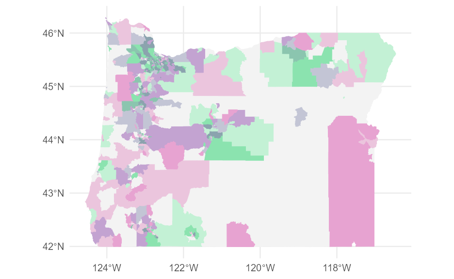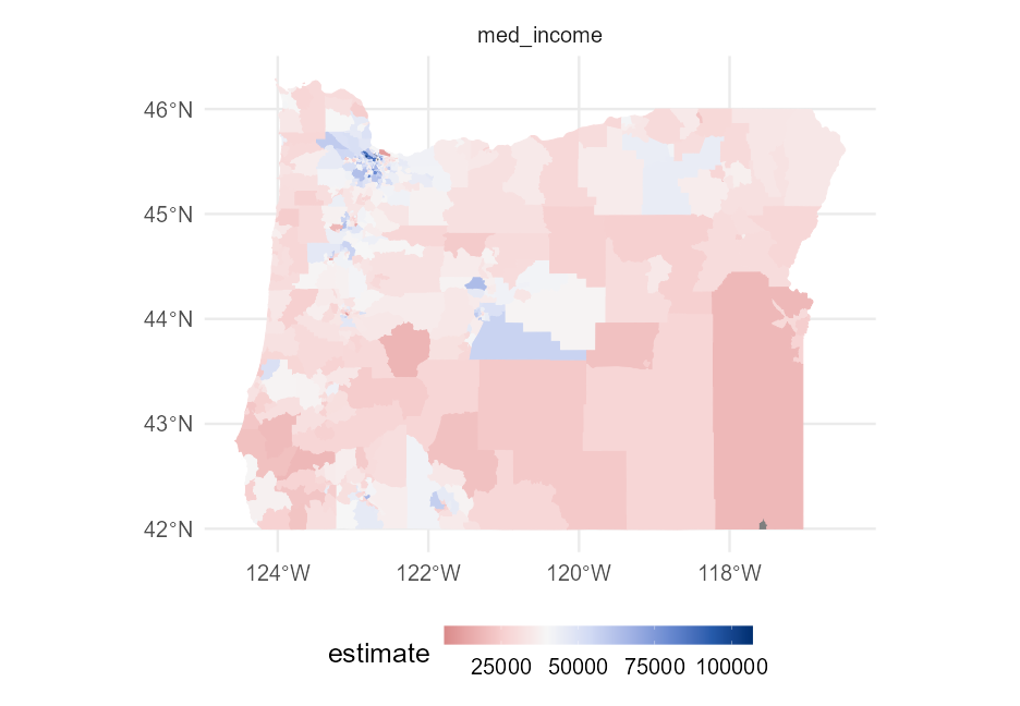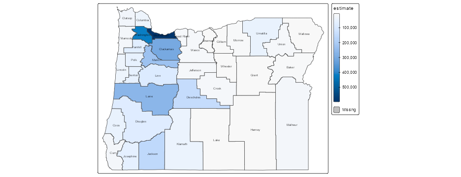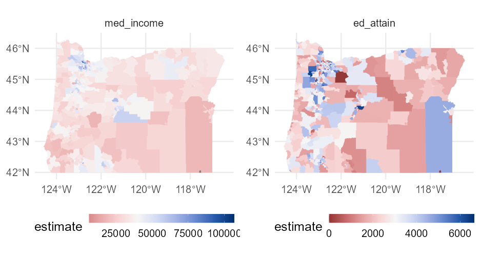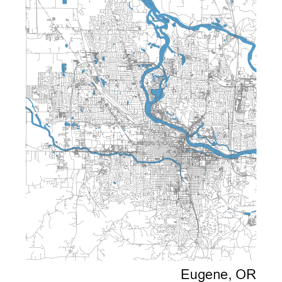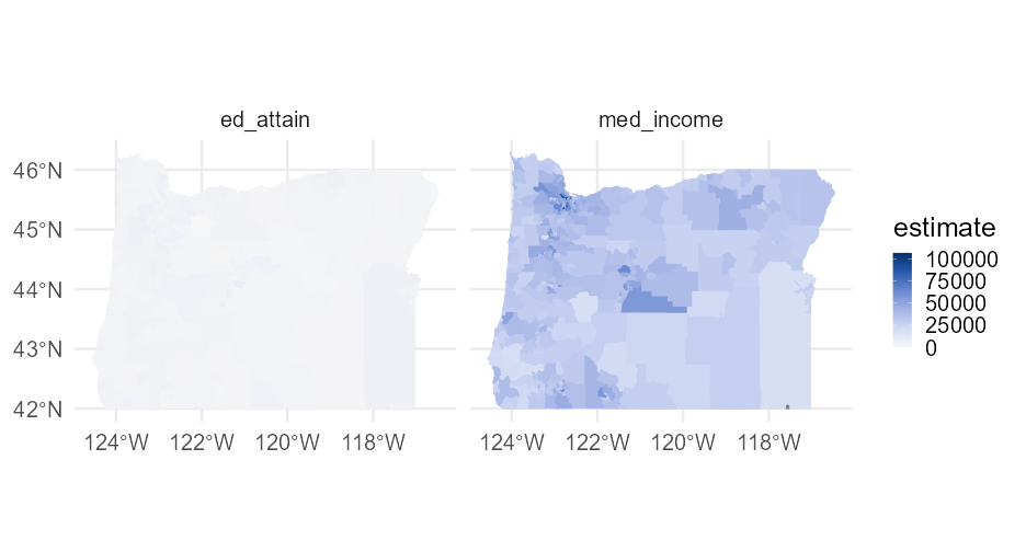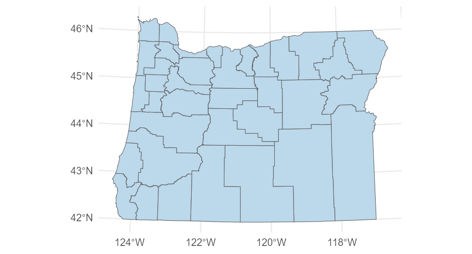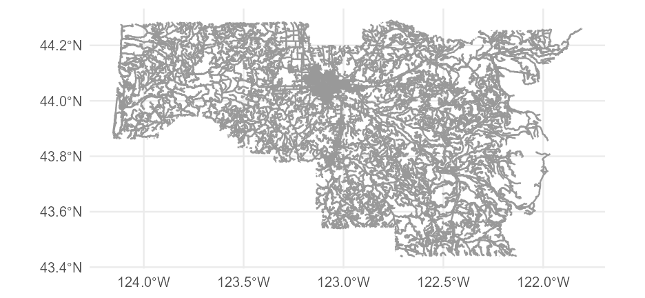 ```` * `quarto render` automatically bundles widget dependencies into `docs/` * Works for: `reactable`, `plotly`, `leaflet`, `mapview`, `DT`, and more * Self-contained per post — just push `docs/` as usual ```` docs/ ├── index.html └── posts/ └── my-post/ └── index.html ← widget dependencies bundled in here ```` --- # Embedding Widgets: Flexdashboard In a flexdashboard, widgets also embed **inline by default** when knitting: ````r ### My Interactive Table ``` r library(reactable) reactable(penguins, searchable = TRUE, filterable = TRUE) ``` ```` * No `saveWidget()` needed — knitting produces one self-contained HTML * Works for all htmlwidgets: `plotly`, `leaflet`, `reactable`, `DT`, etc. * For Shiny-powered widgets, add `runtime: shiny` to YAML and deploy to shinyapps.io instead --- # The Exception: Xaringan Slides Xaringan does **not** support HTML widgets natively — widgets render blank: ````r # This will NOT show in xaringan slides reactable(penguins) ```` The fix — save each widget and embed via `<iframe>`: ````r # Save widget to file saveWidget(reactable(penguins), "widgets/rt_basic.html", selfcontained = TRUE) ```` Then in the slide: ````html <iframe src="widgets/rt_basic.html" width="100%" height="450px" frameborder="0"></iframe> ```` Commit the `widgets/` folder alongside your slides HTML — they must travel together. --- # Which Option Should You Use? | Situation | Approach | |---|---| | Quarto blog post | Use widget directly — Quarto handles it | | Flexdashboard | Use widget directly — embeds on knit | | Xaringan slides | `saveWidget()` + `<iframe>` + commit `widgets/` | | Small data, want simplicity | `self_contained: true` in YAML | | Medium data, reused across posts | Commit `data/` folder | | Sensitive or large data | Remote source + `.gitignore` | --- class: inverse-blue # Data Viz in the wild Cheyna and Ramtin * Kyla and Isha on deck for next week --- class: inverse-blue center middle # Geographic data --- # First — a disclaimer * We're *only* talking about **visualizing** geographic data, not analyzing it -- * There's SO MUCH we won't get to -- * Today is an intro — hopefully you'll feel comfortable with the basics --- # Learning objectives * Know the difference between vector and raster data * Be able to produce basic maps using a variety of tools * Be able to obtain different types of geographic data from a few different places * Be able to produce basic interactive maps * Understand the basics of the R geospatial ecosystem -- ### Today is partially about content and partially about exposure --- # Where to learn more ### [Geocomputation with R](https://geocompr.robinlovelace.net) .center[ <img src="https://geocompr.robinlovelace.net/images/cover.png" width = "260px"> ] --- class: inverse-orange center middle  # Vector versus raster data .footnote[Image from Zev Ross] --- # Vector data * Points, lines, and polygons * Can easily include non-spatial attributes (e.g., population within a polygon) -- * Come in the form of shapefiles (`.shp`), GeoJSON, or frequently in R packages -- ### This is what we'll focus on today Tends to be most relevant for social science research questions --- # Raster data .pull-left[ * Divides space into a grid * Each square (pixel) gets a value ] .pull-right[  ] -- Common formats include images, satellite data, and remote sensing data. -- Can be useful in social science to show things like population density or temperature grids. --- # Example  .footnote[[source](https://www.nytimes.com/interactive/2021/02/16/us/winter-storm-texas-power-outage-map.html)] --- # The #rspatial ecosystem * [{sf}](https://r-spatial.github.io/sf/index.html) — simple features, the standard for vector data * [{terra}](https://rspatial.org/terra/) — modern replacement for {raster} * [{ggplot2}](https://ggplot2.tidyverse.org) — `geom_sf()` for plotting sf objects * [{tmap}](https://github.com/mtennekes/tmap) — thematic map package * [{mapview}](https://r-spatial.github.io/mapview/index.html) — quick interactive maps -- ### Goal today Take you through a basic tour of each of these. --- # Some specific challenges with geospatial data * Coordinate reference systems and projections * List columns (specifically when working with {sf} objects) * Different geometry types (lines, points, polygons) * Vector versus raster --- # Working with spatial data Two main options: * `spatialDataFrame` (from the [{sp}](https://cran.r-project.org/web/packages/sp/sp.pdf) package) — older, less common now * **sf data frame** (simple features) — the modern standard, works natively with tidyverse Use `sf::st_as_sf()` to convert `{sp}` to `{sf}` if needed. --- # {tigris} ``` r library(tigris) library(sf) *options(tigris_class = "sf") roads_laneco <- roads("OR", "Lane") roads_laneco ``` ``` ## Simple feature collection with 20433 features and 4 fields ## Geometry type: LINESTRING ## Dimension: XY ## Bounding box: xmin: -124.1536 ymin: 43.4376 xmax: -121.8078 ymax: 44.29001 ## Geodetic CRS: NAD83 ## # A tibble: 20,433 × 5 ## LINEARID FULLNAME RTTYP MTFCC geometry ## <chr> <chr> <chr> <chr> <LINESTRING [°]> ## 1 1102152610459 W Lone Oak Lp M S1640 (-123.1256 44.10108, -123.1262 44.10109, -123.1263 44.1011, -123.1263 44.10112, -123.1... ## 2 1102217699747 Sheldon Village Lp M S1640 (-123.0742 44.07891, -123.073 44.07891, -123.0729 44.0789, -123.0729 44.0788, -123.072... ## 3 110458663505 Cottage Hts Lp M S1400 (-123.0522 43.7893, -123.0522 43.7894, -123.0521 43.78949, -123.0521 43.7895, -123.052... ## 4 1102152615811 Village Plz Lp M S1640 (-123.1051 44.08716, -123.1058 44.08736, -123.1063 44.08755, -123.1068 44.08778) ## 5 110458661289 River Pointe Lp M S1400 (-123.0864 44.10306, -123.0852 44.10305, -123.0851 44.10305, -123.085 44.10303, -123.0... ## 6 1102217699746 Sheldon Village Lp M S1640 (-123.0723 44.07875, -123.0723 44.07904, -123.0723 44.07937, -123.0723 44.07941, -123.... ## 7 110458664549 Village Plz Lp M S1400 (-123.1053 44.08658, -