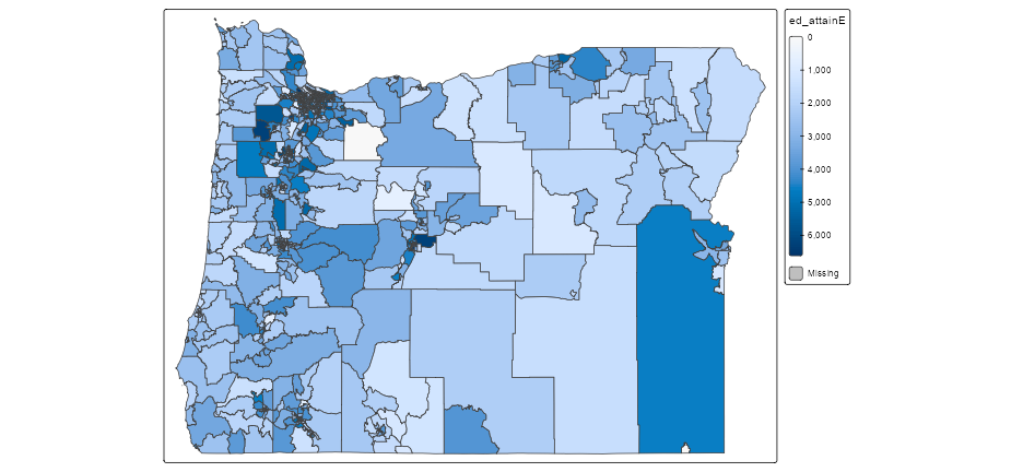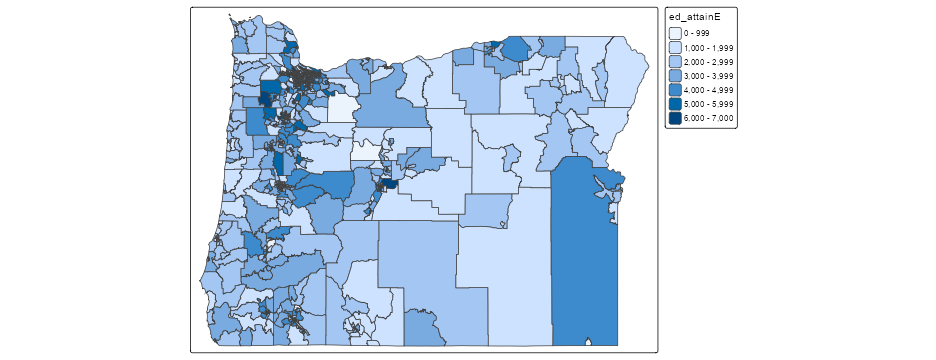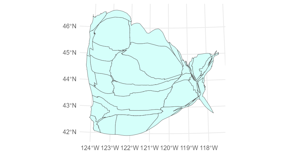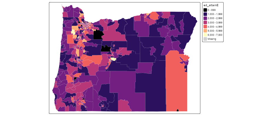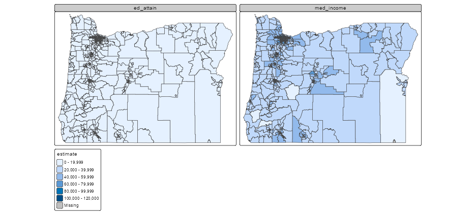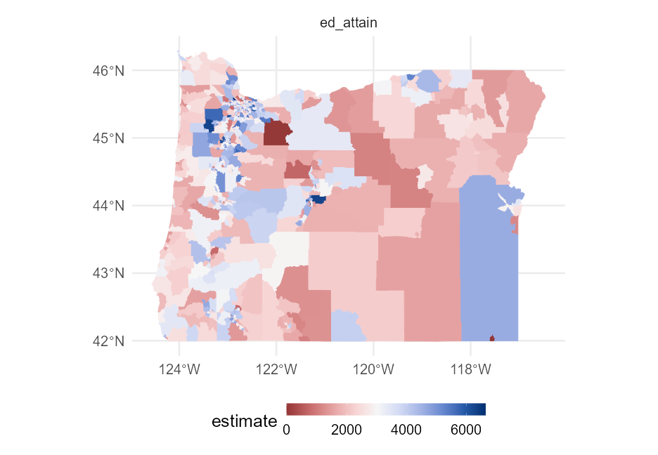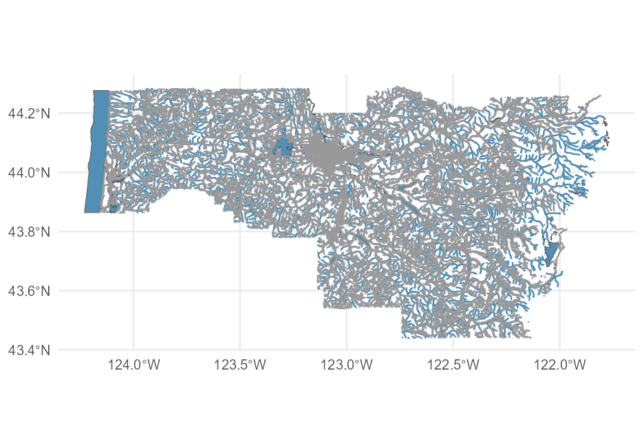```` * `quarto render` automatically bundles widget dependencies into `docs/` * Works for: `reactable`, `plotly`, `leaflet`, `mapview`, `DT`, and more * Self-contained per post — just push `docs/` as usual ```` docs/ ├── index.html └── posts/ └── my-post/ └── index.html ← widget dependencies bundled in here ```` --- # Embedding Widgets: Flexdashboard In a flexdashboard, widgets also embed **inline by default** when knitting: ````r ### My Interactive Table ``` r library(reactable) reactable(penguins, searchable = TRUE, filterable = TRUE) ``` ```` * No `saveWidget()` needed — knitting produces one self-contained HTML * Works for all htmlwidgets: `plotly`, `leaflet`, `reactable`, `DT`, etc. * For Shiny-powered widgets, add `runtime: shiny` to YAML and deploy to shinyapps.io instead --- # The Exception: Xaringan Slides Xaringan does **not** support HTML widgets natively — widgets render blank: ````r # This will NOT show in xaringan slides reactable(penguins) ```` The fix — save each widget and embed via `<iframe>`: ````r # Save widget to file saveWidget(reactable(penguins), "widgets/rt_basic.html", selfcontained = TRUE) ```` Then in the slide: ````html <iframe src="widgets/rt_basic.html" width="100%" height="450px" frameborder="0"></iframe> ```` Commit the `widgets/` folder alongside your slides HTML — they must travel together. --- # Which Option Should You Use? | Situation | Approach | |---|---| | Quarto blog post | Use widget directly — Quarto handles it | | Flexdashboard | Use widget directly — embeds on knit | | Xaringan slides | `saveWidget()` + `<iframe>` + commit `widgets/` | | Small data, want simplicity | `self_contained: true` in YAML | | Medium data, reused across posts | Commit `data/` folder | | Sensitive or large data | Remote source + `.gitignore` | --- class: inverse-blue # Data Viz in the wild Cheyna and Ramtin * Kyla and Isha on deck for next week --- class: inverse-blue center middle # Geographic data --- # First — a disclaimer * We're *only* talking about **visualizing** geographic data, not analyzing it -- * There's SO MUCH we won't get to -- * Today is an intro — hopefully you'll feel comfortable with the basics --- # Learning objectives * Know the difference between vector and raster data * Be able to produce basic maps using a variety of tools * Be able to obtain different types of geographic data from a few different places * Be able to produce basic interactive maps * Understand the basics of the R geospatial ecosystem -- ### Today is partially about content and partially about exposure --- # Where to learn more ### [Geocomputation with R](https://geocompr.robinlovelace.net) .center[ <img src="https://geocompr.robinlovelace.net/images/cover.png" width = "260px"> ] --- class: inverse-orange center middle  # Vector versus raster data .footnote[Image from Zev Ross] --- # Vector data * Points, lines, and polygons * Can easily include non-spatial attributes (e.g., population within a polygon) -- * Come in the form of shapefiles (`.shp`), GeoJSON, or frequently in R packages -- ### This is what we'll focus on today Tends to be most relevant for social science research questions --- # Raster data .pull-left[ * Divides space into a grid * Each square (pixel) gets a value ] .pull-right[  ] -- Common formats include images, satellite data, and remote sensing data. -- Can be useful in social science to show things like population density or temperature grids. --- # Example  .footnote[[source](https://www.nytimes.com/interactive/2021/02/16/us/winter-storm-texas-power-outage-map.html)] --- # The #rspatial ecosystem * [{sf}](https://r-spatial.github.io/sf/index.html) — simple features, the standard for vector data * [{terra}](https://rspatial.org/terra/) — modern replacement for {raster} * [{ggplot2}](https://ggplot2.tidyverse.org) — `geom_sf()` for plotting sf objects * [{tmap}](https://github.com/mtennekes/tmap) — thematic map package * [{mapview}](https://r-spatial.github.io/mapview/index.html) — quick interactive maps -- ### Goal today Take you through a basic tour of each of these. --- # Some specific challenges with geospatial data * Coordinate reference systems and projections * List columns (specifically when working with {sf} objects) * Different geometry types (lines, points, polygons) * Vector versus raster --- # Working with spatial data Two main options: * `spatialDataFrame` (from the [{sp}](https://cran.r-project.org/web/packages/sp/sp.pdf) package) — older, less common now * **sf data frame** (simple features) — the modern standard, works natively with tidyverse Use `sf::st_as_sf()` to convert `{sp}` to `{sf}` if needed. --- # {tigris} ``` r library(tigris) library(sf) *options(tigris_class = "sf") roads_laneco <- roads("OR", "Lane") roads_laneco ``` ``` ## Simple feature collection with 20433 features and 4 fields ## Geometry type: LINESTRING ## Dimension: XY ## Bounding box: xmin: -124.1536 ymin: 43.4376 xmax: -121.8078 ymax: 44.29001 ## Geodetic CRS: NAD83 ## # A tibble: 20,433 × 5 ## LINEARID FULLNAME RTTYP MTFCC geometry ## <chr> <chr> <chr> <chr> <LINESTRING [°]> ## 1 1102152610459 W Lone Oak Lp M S1640 (-123.1256 44.10108, -123.1262 44.10109, -123.1263 44.1011, -123.1263 44.10112, -123.1... ## 2 1102217699747 Sheldon Village Lp M S1640 (-123.0742 44.07891, -123.073 44.07891, -123.0729 44.0789, -123.0729 44.0788, -123.072... ## 3 110458663505 Cottage Hts Lp M S1400 (-123.0522 43.7893, -123.0522 43.7894, -123.0521 43.78949, -123.0521 43.7895, -123.052... ## 4 1102152615811 Village Plz Lp M S1640 (-123.1051 44.08716, -123.1058 44.08736, -123.1063 44.08755, -123.1068 44.08778) ## 5 110458661289 River Pointe Lp M S1400 (-123.0864 44.10306, -123.0852 44.10305, -123.0851 44.10305, -123.085 44.10303, -123.0... ## 6 1102217699746 Sheldon Village Lp M S1640 (-123.0723 44.07875, -123.0723 44.07904, -123.0723 44.07937, -123.0723 44.07941, -123.... ## 7 110458664549 Village Plz Lp M S1400 (-123.1053 44.08658, -
