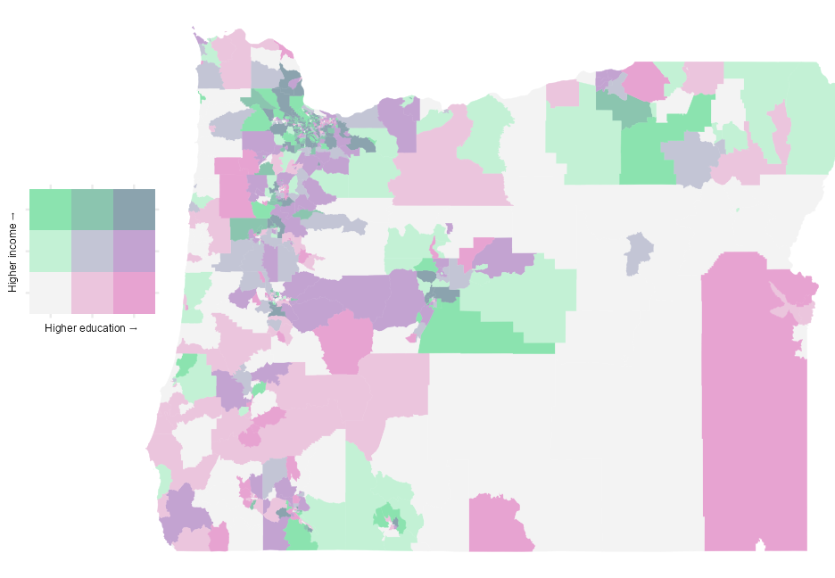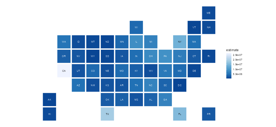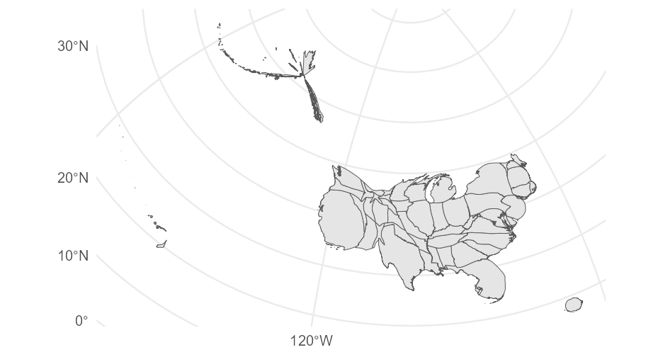 --- class: inverse-blue center middle # A few other things of note --- # statebins ``` r library(statebins) statebins(states, state_col = "NAME", value_col = "estimate") + theme_void() ``` <!-- --> --- # Cartograms ``` r library(cartogram) or_county_pop <- get_acs( geography = "county", state = "OR", variables = "B01003_001", year = 2022, geometry = TRUE ) or_county_pop <- st_transform(or_county_pop, crs = 2992) carto_counties <- cartogram_cont(or_county_pop, "estimate") ``` --- # Compare .pull-left[ ``` r ggplot(or_county_pop) + geom_sf(fill = "#BCD8EB") ``` <!-- --> ] .pull-right[ ``` r ggplot(carto_counties) + geom_sf(fill = "#D5FFFA") ``` <!-- --> ] --- # US cartogram by population ``` r state_pop <- get_acs( geography = "state", variables = "B01003_001", year = 2022, geometry = TRUE ) state_pop <- st_transform(state_pop, crs = 2163) carto_states <- cartogram_cont(state_pop, "estimate") ``` --- ``` r ggplot(carto_states) + geom_sf() ``` <!-- --> --- # Last note You may or may not like cartograms. -- Just be careful not to lie with maps.  --- class: inverse-green # Next time: Shiny App+ Some final presentations!